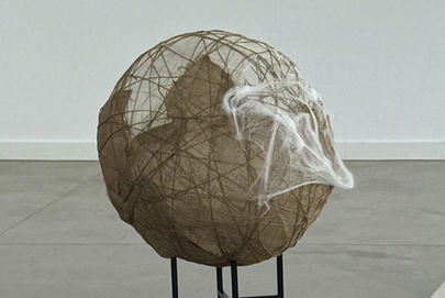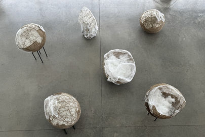 “Origen Asmático” es una instalación escultórica compuesta por una serie de estructuras orgánicas que remiten a nidos, úteros o refugios primarios. Las formas están construidas con materiales naturales como arpillera, alambre vegetal y cuerda y en su interior y en el exterior hay texturas diferentes de algodón. El conjunto sobre el suelo pretende crear una atmósfera ambigua: lo que parece un espacio de protección, un nido, una cuna, al observarse más de cerca puede parecer un capullo, que alberga un contenido potencialmente dañino. Lo que me gustaría es que el espectador viera estas formas y su contenido simbólicamente ligeros y frágiles, pero a la vez alérgicos, tóxicos, irritantes. Puede convertirse en algo letal para quienes padecen alergia ambiental. Los nidos que deberían proteger al ser vivo, se convierten en lugares que lo enferman.